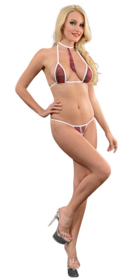 Женский клетчатый костюм ученицы. Состоит из 3 предметов: лифа, стрингов и галстука. Все три предмета с белой оторочкой. В комплекте: лиф, трусики-стринги, галстук.