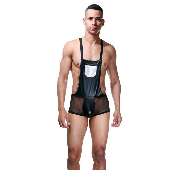 Мужское боди, представляющее собой трусы-боксеры из полупрозрачной черной ткани с нагрудником и лямками. Гульфик у трусов, нагрудник и лямки сшиты из непрозрачной, гладкой и эластичной блестящей ткани. Спереди на нагруднике светлый карман.