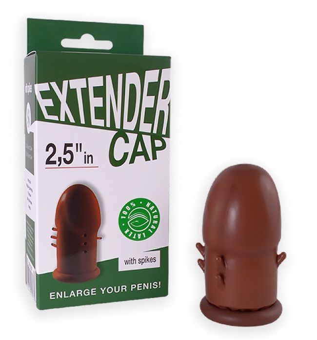 Коричневый латексный удлинитель пениса 2.5 in с шипиками. Прирост длины - 6,3 см.
