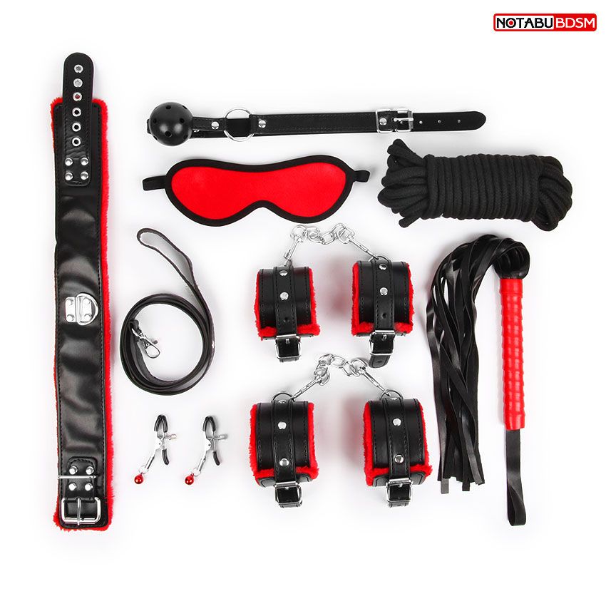 Великолепный набор аксессуаров для любителей БДСМ. В комплект входят наручники, оковы, ошейник, поводок, верёвка, кляп, маска, зажимы для сосков, плеть. Наручники и оковы снабжены металлической цепочкой, которая позволяет скреплять изделия вместе. Внешняя сторона наручников, оков и ошейника выполнена под кожу, внутренняя отделана мехом, который предотвращает натирание кожи. Кляп состоит из пластмассового шарика с отверстиями для дыхания и ремней с возможностью регулировки размера. Маска изготовлена из мягкой ткани, крепится на голове с помощью резинки. Зажимы для сосков имеют эластичные накладки, которые препятствуют сильному сдавливанию сосков. На каждом изделии предусмотрен регулировочный винт, позволяющий контролировать силу сдавливания сосков. Небольшие подвески украшают зажимы. Плеть-флогер состоит из хвостов и отделанной искусственной кожей рукоятки с петлей. В комплекте: наручники, оковы, ошейник, поводок, верёвка, кляп, маска, зажимы для сосков, плеть.